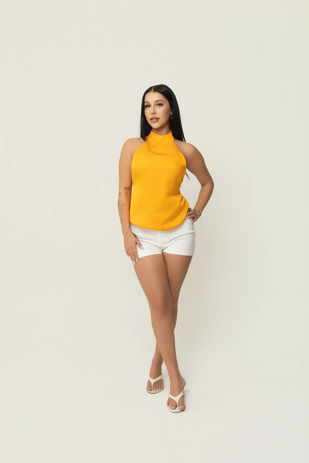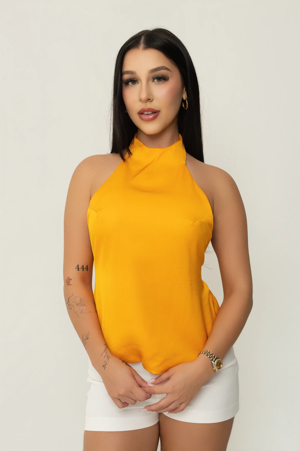 Confeccionado em cetim leve com caimento impecável, ele traz um visual sofisticado e moderno, perfeito para dias quentes ou noites de verão.