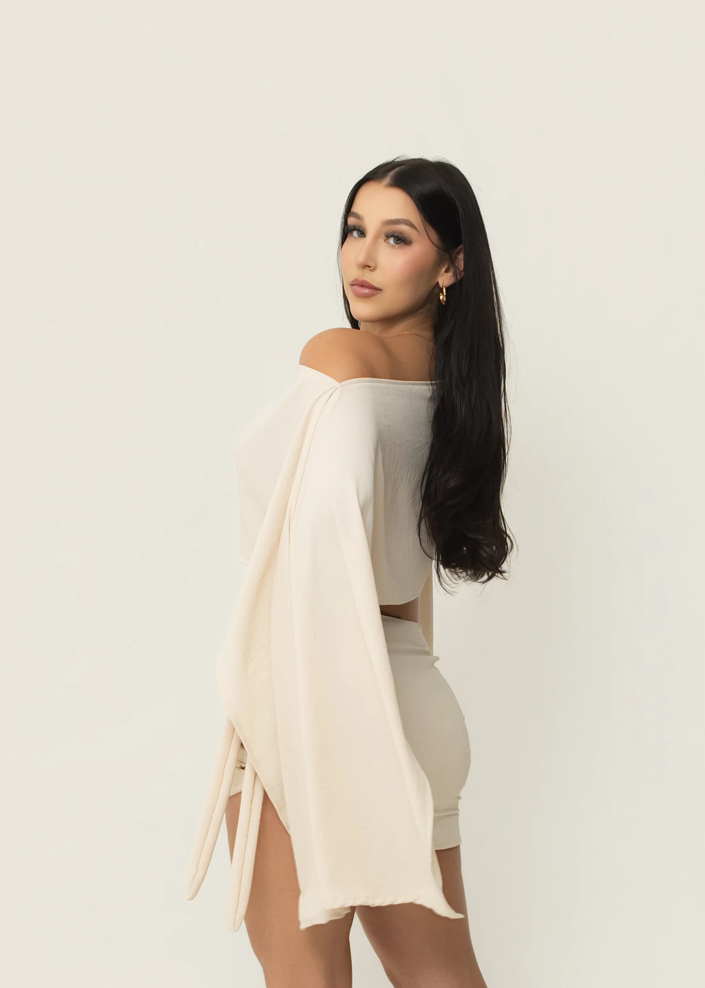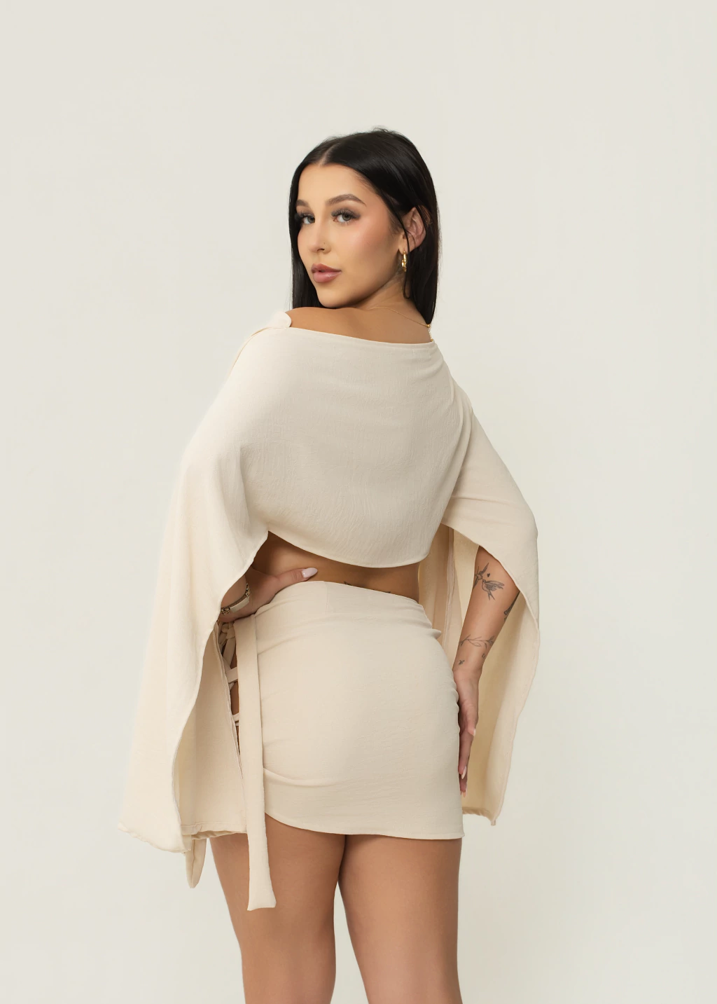 O Conjunto Mojito é composto por cropped de um ombro só com manga ampla e fluida, que traz movimento e sofisticação, e mini saia com amarrações laterais, valorizando a silhueta com um toque sensual na medida certa.