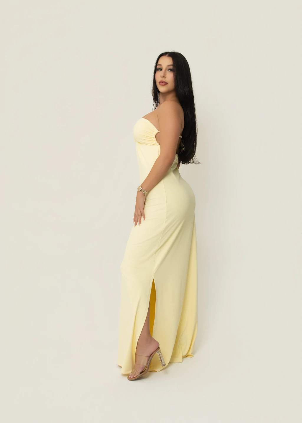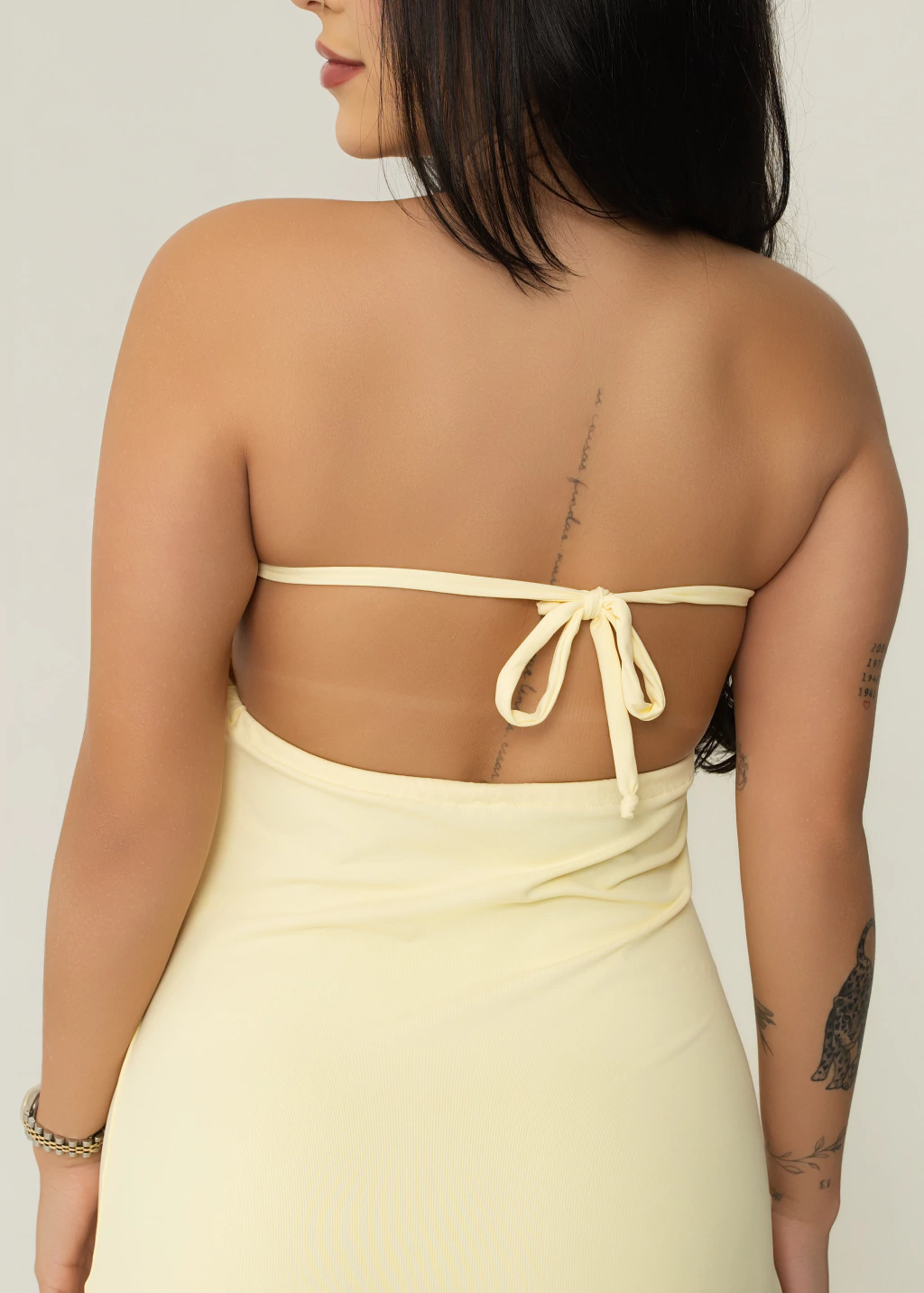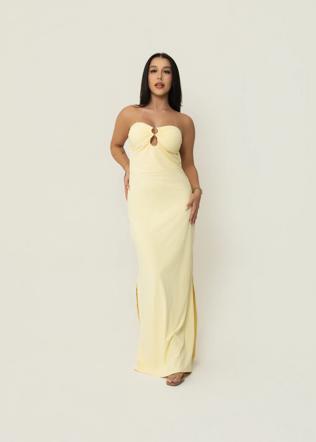 Com modelagem ajustada que valoriza as curvas e fenda lateral que traz leveza e movimento, o destaque fica por conta do decote estruturado com detalhe franzido e argola dourada, que adiciona um toque moderno e sensual na medida certa.